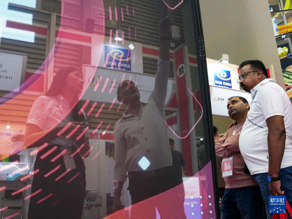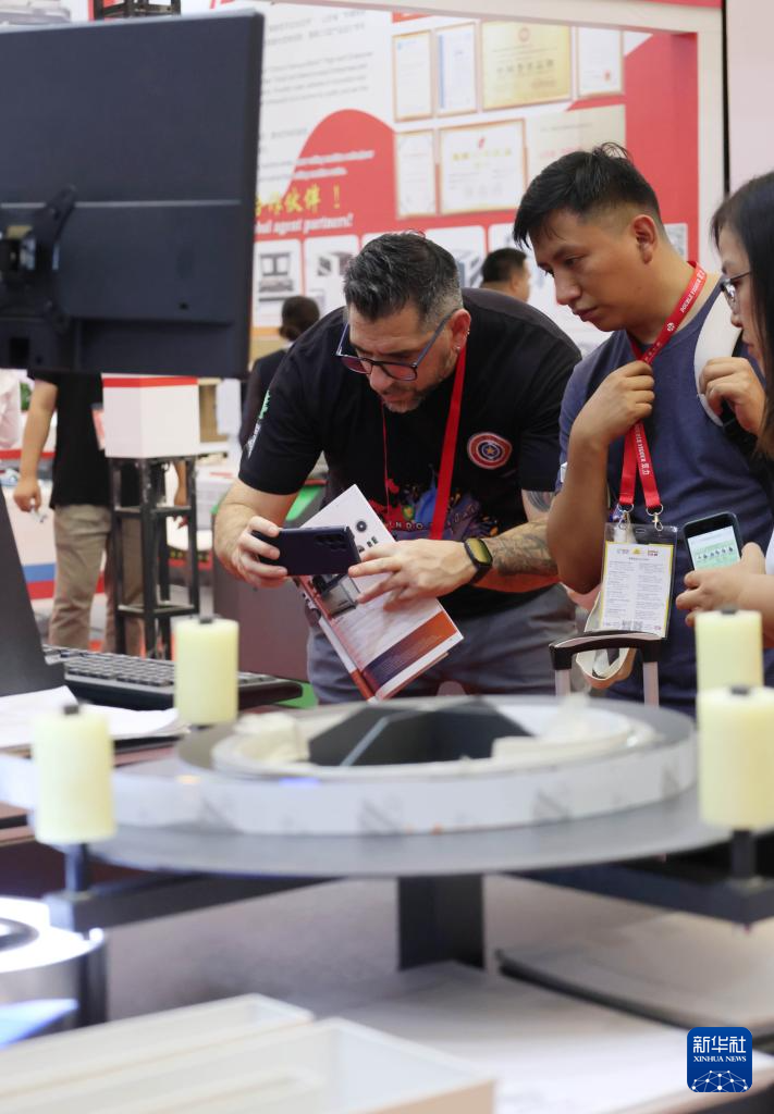 9月17日,参观者在了解制作广告标牌的3D打印设备。