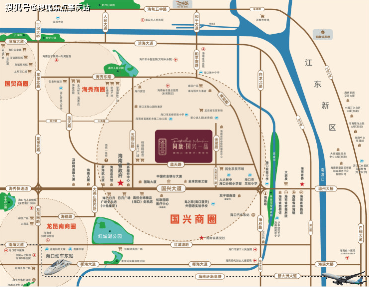 交通配套:位于国兴商务生活圈,由国兴大道、蓝天路、大英山西二街等三条城市干道及五指山路、大英山一至五路等多维路网组成,接驳海秀快速路及南大桥、海府桥两座立交桥,周边直线 个公交站,距离最近的南宝商场站仅有 162m。